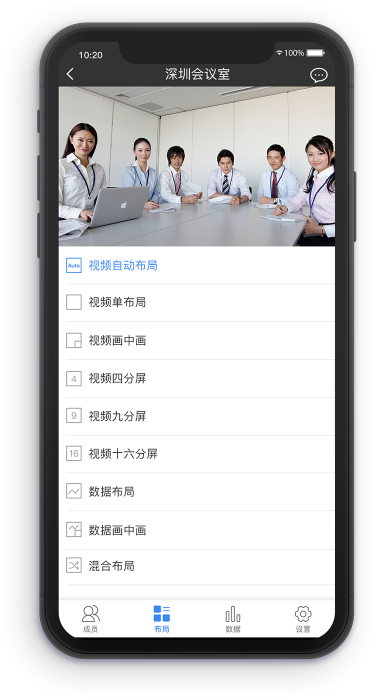 在手機app 上可對會議的權(quán)限、布局進行控制,簡單方便的遠(yuǎn)程協(xié)作體驗。